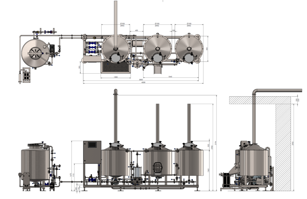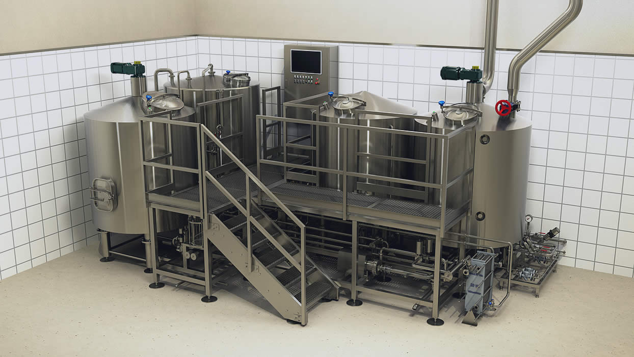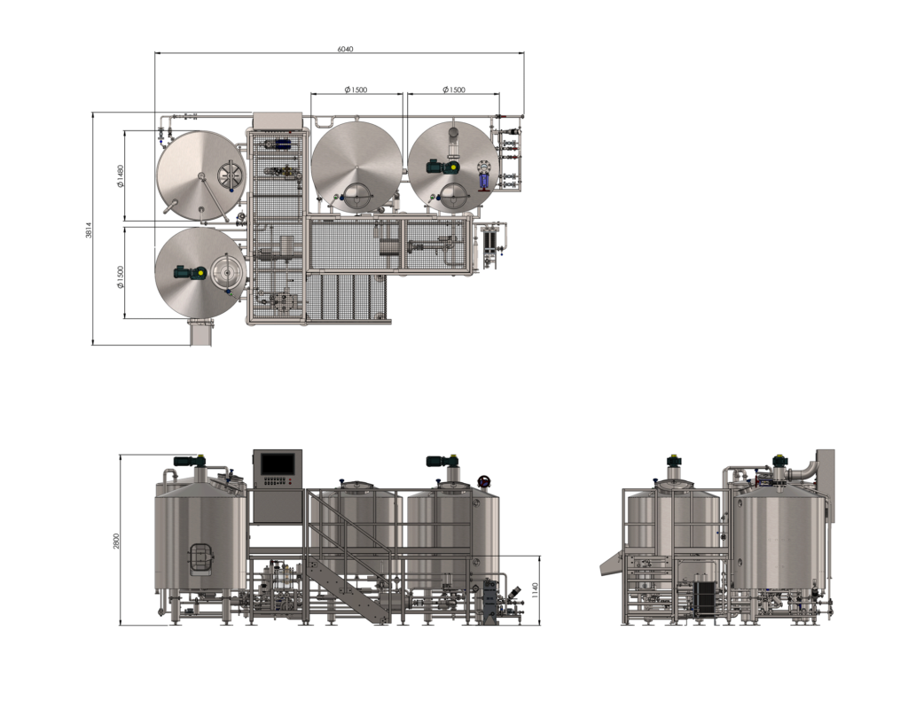 Die 5HL Brauanlagen ist mit pneumatischen Ventilen und einer umfangreichen Verrohrung ausgestattet. Die Anlage ist aufgebaut in Sonderausführung, Maischepfanne, Läuterbottich/ Whirlpoolkombination. Sie beinhaltet Rührwerk, Hackwerk und eine Produktpumpe. Alle 3 sind frequenzgesteuert.