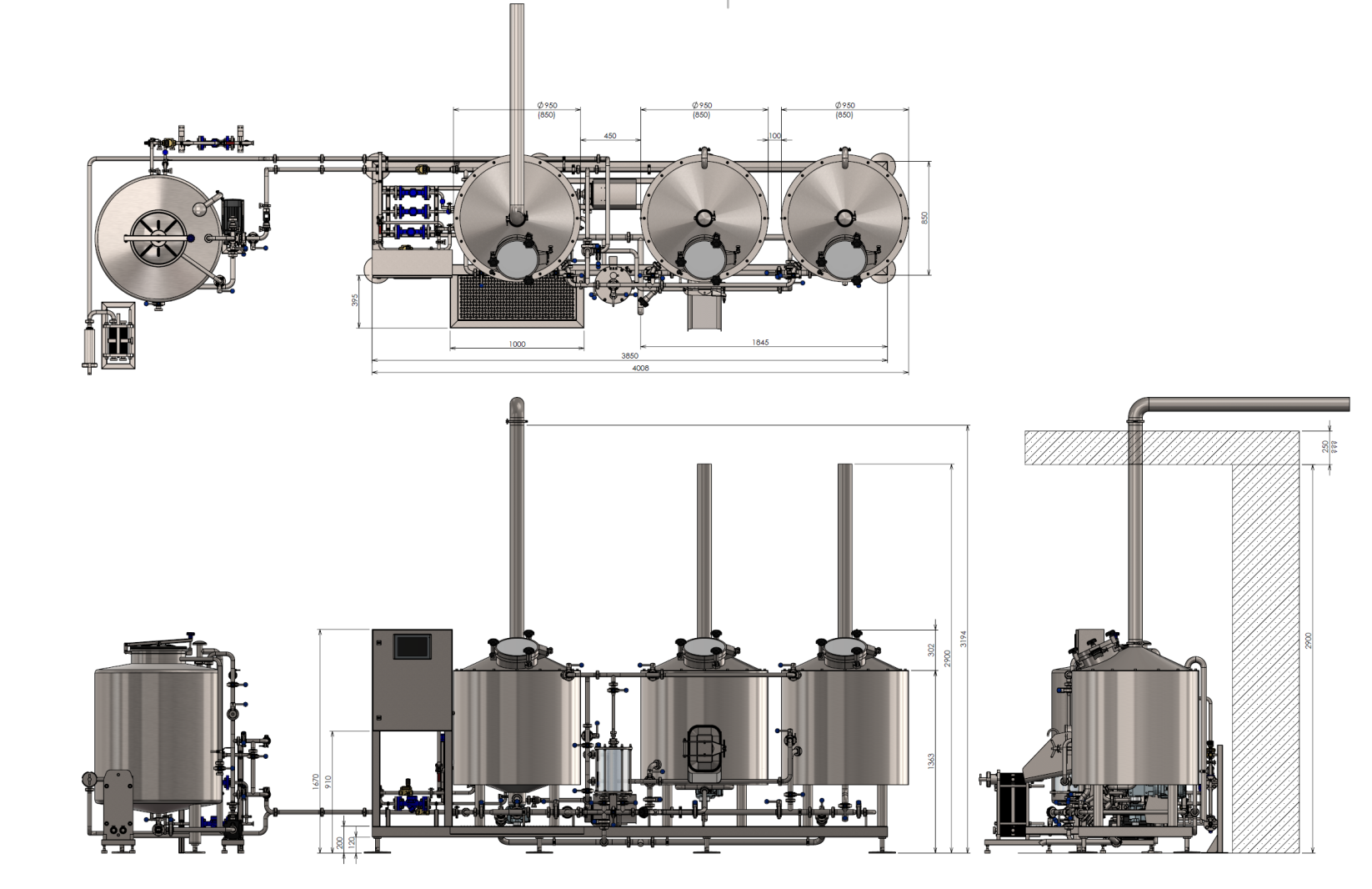 Die 10HL Brauanlagen ist mit pneumatischen Ventilen und einer umfangreichen Verrohrung ausgestattet. Die Anlage ist aufgebaut in klassischer Ausführung, Maischepfanne, Läuterbottich, Whirlpool. Sie